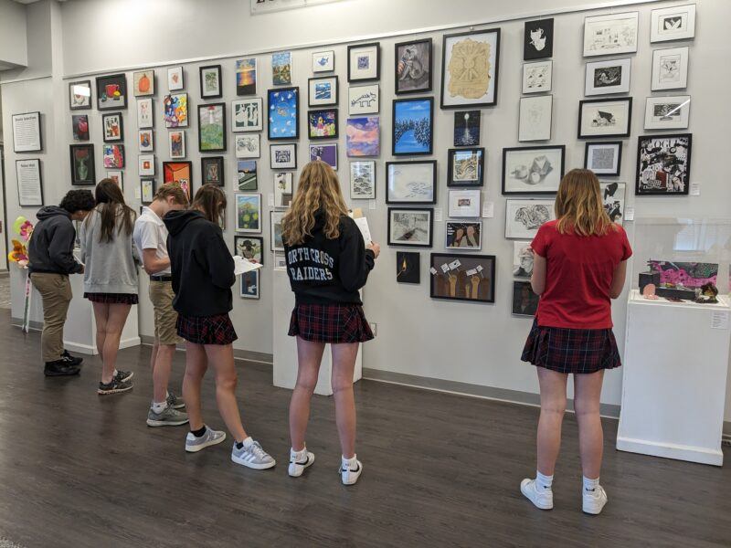 How, too, could I encourage students to consider the display of their art as part of their process? For one project, they arranged a crochet coral reef exhibit I had initially designed, and then they rearranged it again and again for new spaces. For another exhibit, I was interested in creating a studio wall to highlight the many types of work they had created. The students ran with that plan, as well, deciding to arrange nearly 100 pieces by color like a rainbow on the wall. They researched studio walls and discovered they were “invented” in pre-revolution France as a way for everyone to enjoy art, not just the aristocracy. The students felt this expressed the process in our studio perfectly, and I agreed. My ideas for “curating as making” shifted to them in a beautiful way.