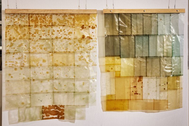 Over the course of Bio-studio, the students took heed of Mattingly’s and French’s practice and made a collaborative artwork using the bioplastics they had produced. The artwork used sustainable and renewable agar, glycerin (a biodegradable substance), and water. The bioplastic was coloured using locally sourced natural materials where possible. Students spoke of the Bio-studio program as an opportunity to learn more about the materials in our class–“I was able to explore the idea of sustainability further, as there is so little that we actually know works, but there’s so much more to experiment with.” Next semester, this artwork and the offcuts will be melted back down and there will be another iteration of learning with another group of students. Nothing will go to the landfill.