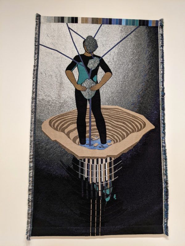 Otobong Nkanga's long black tapestry "Double Plot," a headless figure and tree stand to the left while orbs float in the middle.