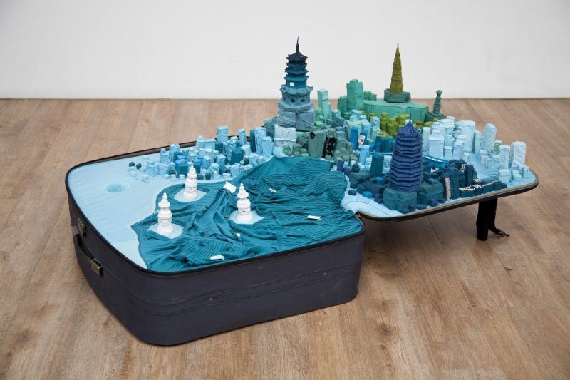 Yin Xiuzhen. “Portable City: Hangzhou,” 2011. Suitcase, clothes, magnifying glass, map, sound element; 11 × 59 13/16 × 34 5/8 in. (28 × 152 × 88 cm). © Yin Xiuzhen. Courtesy Pace Gallery.