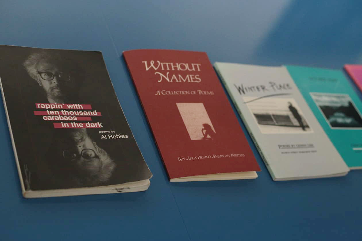 Installation view of Pilipinx American Library, Asian Art Museum, 2018. Al Robles, Rappin’ With Ten Thousand Carabaos in the Dark: Poems, 1996. Kearny Street Workshop publications: Without Names, (1985), Winter Place (1989), October Light (1987). Photo: Anthony Bongco.