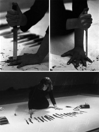 Characterized by endurance and pain—and by repetitive behavior, actions of long duration, and intense public interactions and energy dialogues—her work has engaged, fascinated, and sometimes repelled live audiences. The universal themes of life and death are recurring motifs, often enhanced by the use of symbolic visual elements or props such as crystals, bones, knives, tables, and pentagrams. While the sources of some works lie in her personal history (the circumstances of her childhood and family life under Communist rule in the former Yugoslavia), others lie in more recent and contemporary events, such as the wars in her homeland and other parts of the world.