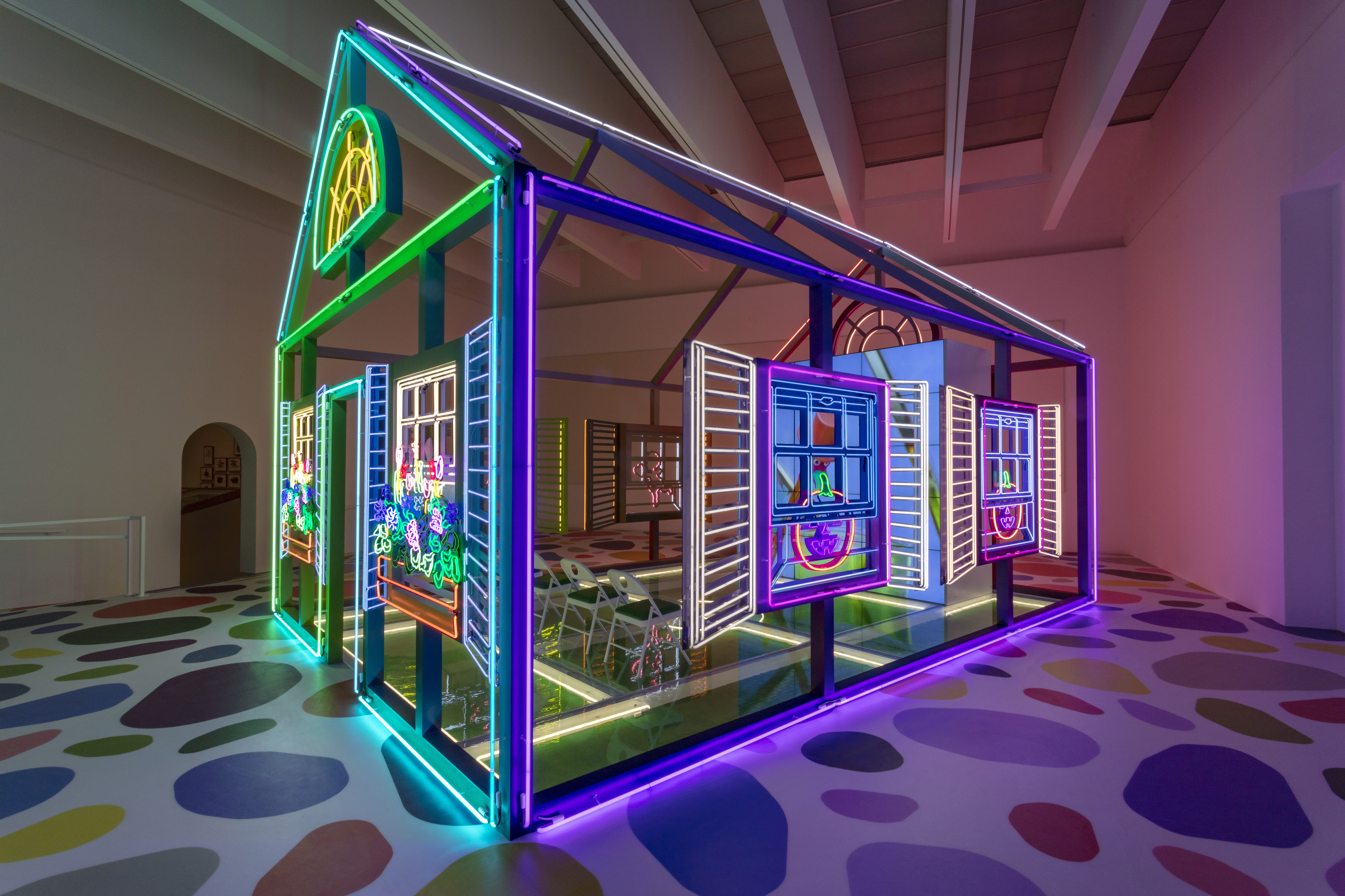 Da Corte was raised between Camden, New Jersey; Pittsburgh, Pennsylvania; and Caracas, Venezuela. As a child, he aspired to be a Walt Disney animator. References to Disney cartoons and familiar characters from children’s stories, like Frankenstein’s monster and the Wicked Witch of the West, reoccur in his videos alongside anthropomorphized everyday objects such as a bottle of ketchup and pop-culture figures like the rapper Eminem. Da Corte portrays many of the characters in his videos himself. The videos are installed in dreamlike, immersive environments, replete with colorful carpets, brightly painted walls, and neon lights. Underscoring the handmade nature of his work is its sleek and highly stylized appearance; Da Corte works with a team of artists to create every aspect of the videos and installations, from make-up to costumes to set pieces. Da Corte’s contrasting, remixing and flattening of disparate images and icons detaches them from their original meanings, allowing him to concoct new stories about familiar characters with a mixture of empathy, criticism, comedy, and the macabre.