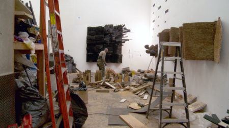 Leonardo Drew was born in Tallahassee, Florida in 1961, and grew up in Bridgeport, Connecticut. Although often mistaken for accumulations of found objects, his sculptures are instead made of “brand new stuff”—materials such as wood, rusted iron, cotton, paper, and mud—that he intentionally subjects to processes of weathering, burning, oxidation, and decay. Whether jutting out from a wall or traversing rooms as freestanding installations, his pieces challenge the architecture of the space in which they’re shown.