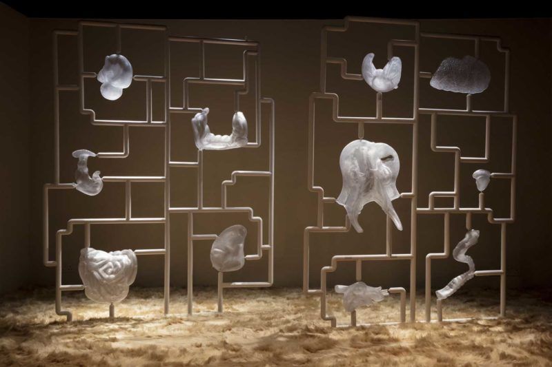 Test tubes and petri dishes feature prominently in Fan’s practice, as the artist often utilizes biological substances such as testosterone, estrogen, and melanin in their sculptures. Fan has worked with a research lab to manufacture and extract these often politically contested materials, detaching them from the context of the body in order to examine their significance. For a series of sculptures entitled Systems, Fan injected testosterone, estrogen, and melanin into organ-like glass-blown globules, which were then precariously hung from forms resembling lattices. In the video work, Mother Is a Woman, Fan used estrogen from their mother’s urine to create a custom beauty cream, asking if qualities like femininity and maternalism usually associated with estrogen could be transferred through a commercial product. Such works question the role that these biological substances have played in constructing binary identity categories and draw upon the artist’s experiences of being racialized and gendered. Ultimately, Fan asks, “How can we be certain that the binary can satisfy us?”