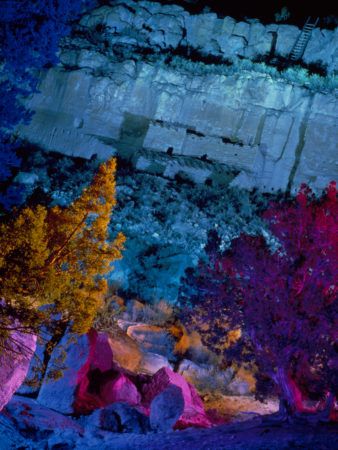 On a grander scale, Kasten also pictures architectural spaces and landscapes, manipulating the environment through carefully placed mirrors and dramatic gemlike tones. Kasten’s video projections of rotating objects and planes of drifting color, cast onto building exteriors and interiors, destabilize the architecture through the optical fragmentation of forms.