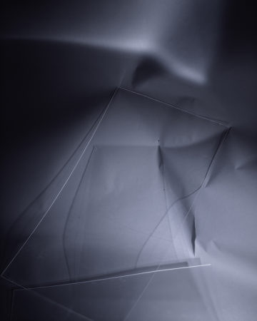This led her to photograph elaborate compositions of objects in the studio—such as Platonic shapes, paper, plexiglass, and wire—often illuminated by theatrical lighting and colored gels. When recorded by her large-format camera—and without digital manipulation—Kasten’s arrangements become ambiguous in scale, confusing in spatial dimensions, and uncertain in differentiation between surface, shape, and shadow.