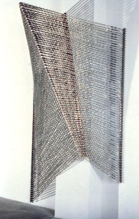 Liz Larner was born in Sacramento, California in 1960. She experiments with abstract sculptural forms in a dizzying array of materials, including polychromatic ceramics that evoke the tectonic geologic shifts of the western landscape. An inventor of new forms, Larner’s sculptures are not easy to categorize. They defy easy description by design, such as the geometric sculpture of a cube turning into a sphere that is both yet neither, or a complex chain of linked metal rings that never tangles and can also be worn as jewelry.