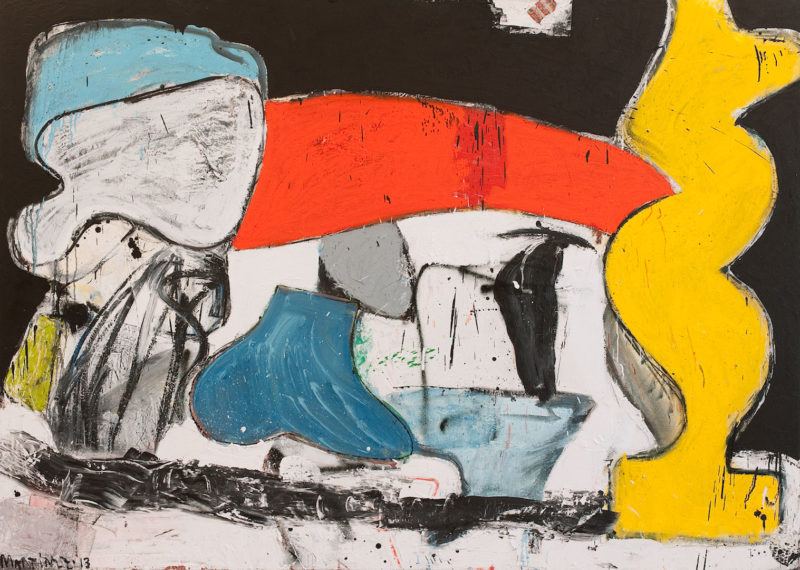 Working between representation and abstraction, he paints in oil, enamel, and spray paint while often incorporating found objects, in a fast-paced practice that could be compared to automatism.