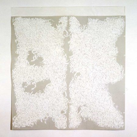 Ryman isolates the most basic of components (material, scale, and support), enforcing limitations that allow the viewer to focus on the physical presence of the work in space. Since the 1950s, Ryman has used primarily white paint on a square surface—whether canvas, paper, metal, plastic, or wood—while harnessing the nuanced effects of light and shadow to animate his work. In Ryman’s oeuvre, wall fasteners and tape serve both practical and aesthetic purposes. Neither abstract nor entirely monochromatic, Ryman’s paintings are paradoxically “realist” according to the artist’s own lexicon.