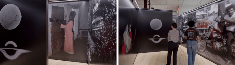 I think that is how we arrived at one of my favorite scenes in the film, the Picture Unit sequence. The Picture Units, AJ’s large architectural, maze-like installations filled with images, have become some of my favorite works of AJ’s during the process of making this film. The experience of the Picture Unit, for me, is like physically walking through the internet: it can be disorienting and dizzying, the assortment of images you encounter feels just specific enough to not feel random but the organizing principle isn’t fully clear either, and suddenly you’ll get hit with an image depicting graphic violence that makes you question everything you’ve seen before and all that you’ll see after. Now, the reason I like this section of the film so much is because we were trying to capture that embodied experience of moving through the Picture Unit, the confusion and dizziness, the surprise, the feeling of being a bit trapped, while also situating people in the space and giving them an opportunity to read the images. I think where we landed does that, but it took a lot of edits and tweaks to get that balance of clarity and disorientation just right. That’s thanks to Winnie, who was able to translate descriptions of what I wanted this scene to feel like into something concrete.