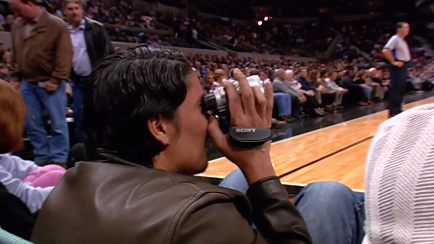 Paul Pfeiffer filming a San Antonio Spurs vs. Miami Heat NBA basketball game, San Antonio, TX, 2003. Production still from the Art in the Twenty-First Century Season 2 episode, Time. © Art21, Inc. 2003.