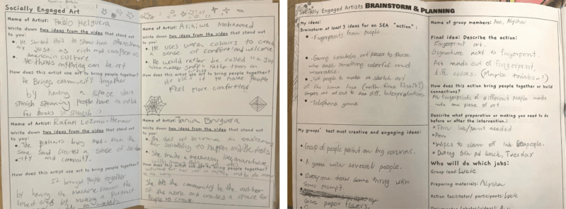 It was a stimulating novelty for students to be given a creative prompt that did not necessarily involve the use of traditional art materials. It was a new concept to have full-reign over their ideation and to think of collaborative brainstorming as CREATING. Entering the realm of conceptual art by creating an experience rather than a tangible object eliminated the critical pressures of having to make something that “looks good”. Students learned to appreciate that “creativity” is also about finding novel ways of doing things, being open to new ideas, and finding solutions to any obstacles presented. As Linda Goode Bryant says in speaking about her artist collective, JAM, in “Friends and Strangers,” “It never was about objects, it never was about commerce, it was about creativity and frankly JAM was an artwork for me.”