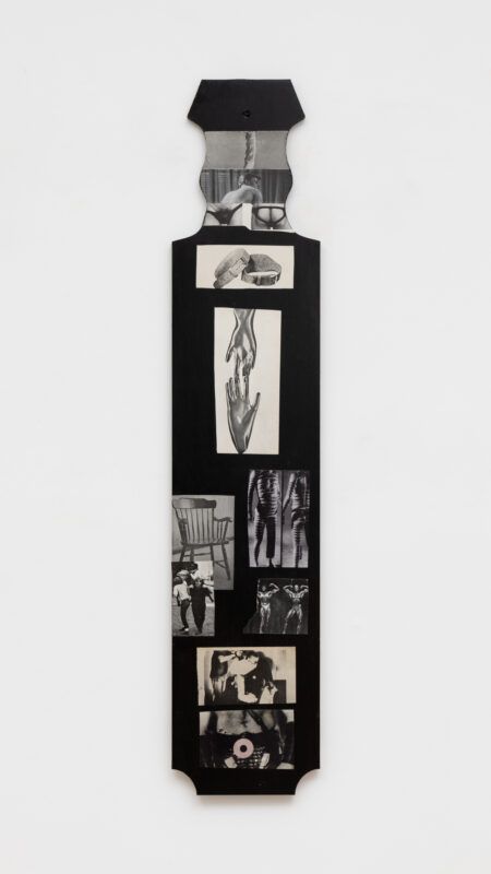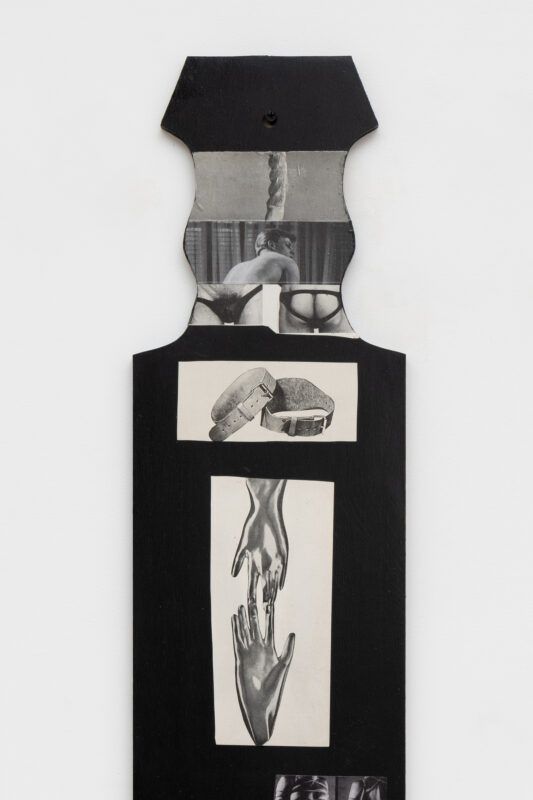 Some of the images I find to be most bizarre and beautiful, and can feel particularly erotic in the environment of the paddles, are from old fraternity yearbook magazines taken in very mundane contexts. Objects like chairs, close-ups of rope, and hands that look like they are in latex gloves reaching out to touch one another become more strange and complicated in the context of my work. I’m aware of and interested in the one-noted or “obviousness” of the pornographic images mixed into my work, but they are also being taken out of their immediate context of titillation. There’s something about them that’s strange, that you come back to and think about. I try not to overly complicate the connections, but to allow for room and to let that which is already quite complicated be complex rather than just a one-to-one juxtaposition.