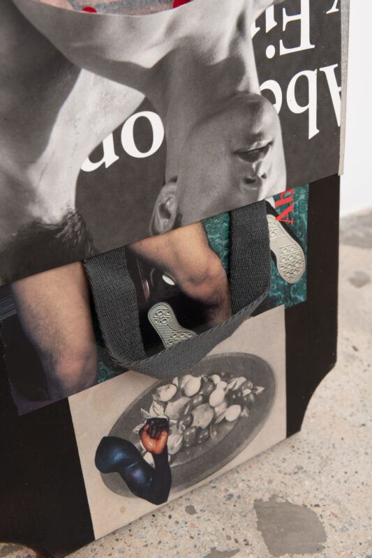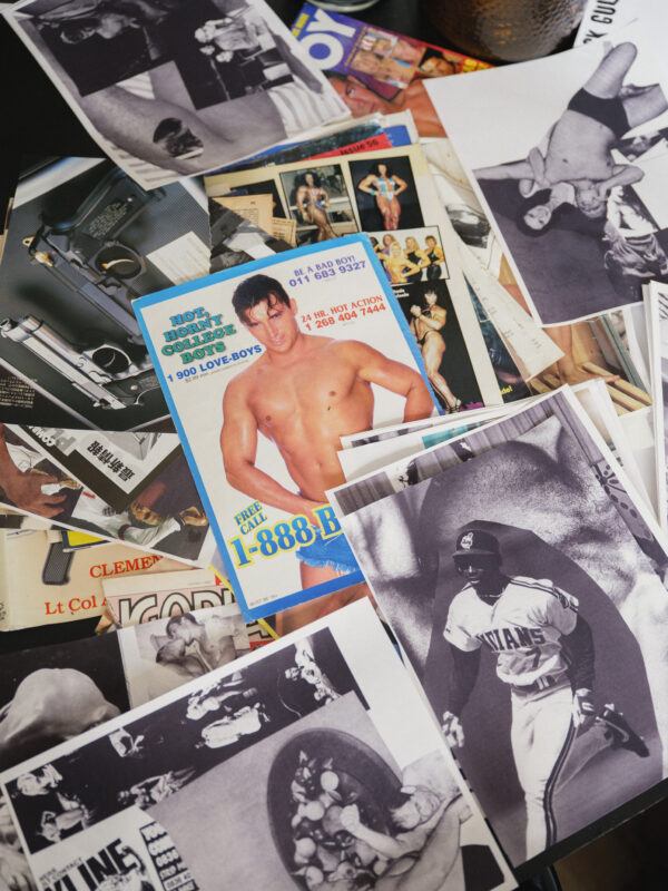The idea of restraint is important and comes up in my practice in literal ways (images of men tied up taken from BDSM magazines) and in more figurative ways (cutouts from mainstream fashion and advertising, like 2000s Abercrombie & Fitch materials). In the latter, there is another kind of restraint or restriction of the body at play: these bodies represent a lack or exclusion, you realize what is missing in this narrow idea of “All-American” imagery (i.e, white, toned, young, seemingly affluent, and “collegiate”). There’s a darkness, a fraught heaviness in revisiting these nostalgic images, we like to believe we “know better” but they can still have the power to seduce us all over again, especially when looking through a homoerotic lens. There’s both pleasure and violence in these restrictive constructions of masculinity that I’m interested in, there’s a constant interplay going on—a dance or a wrestling match between signs, identities, domination and surrender, reality and fantasy. Collage can allow us to look at images differently, especially the ones we feel we may already know so well. Hopefully, there’s a bit of catharsis in those juxtapositions.