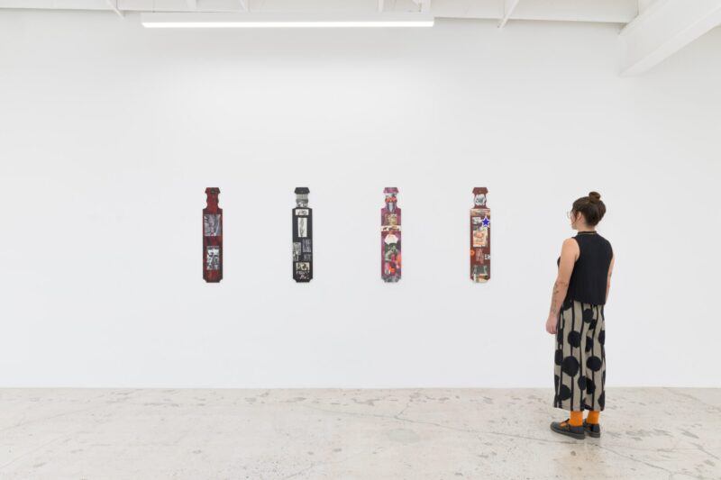 My 2023 Exhibition at Anat Ebgi, “Fratricide,” was based around collaged fraternity paddles. I was thinking about sex, violence, ritual, and play, in the context of fraternities, the family, and the military: institutions that are vital to the normative American self-image but which are built on brutality and coercion. The things I’m interested in with regard to the paddles and these homosocial spaces are these relationships between power and desire, violence and eroticism. I’m using this as an entry point to look more closely at how power functions and to see how it could be made strange: where assumptions might be uprooted, or the seemingly concrete might unravel.