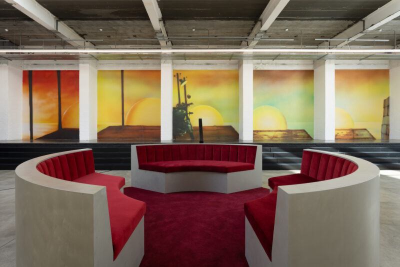 In the exhibition, the main gallery was brightly lit and included various works and architectural interventions: from a large basketball scoreboard mysteriously counting down and keeping score to a frieze of sunsets taken from Rainer Werner Fassbinder’s “Querelle,” to a red velvet and concrete circular conversation pit and whitewashed windows. In contrast, I turned what is normally the “Reading Room” annex space into a sort of bunker, separated from the main room by a perpetually-open steel razor wire ornate door.