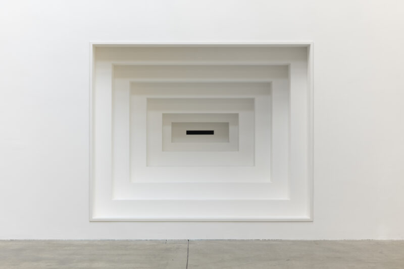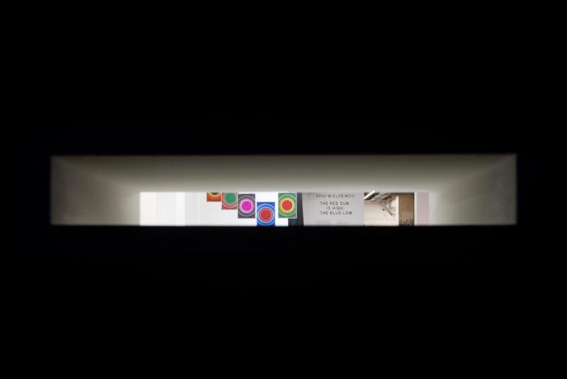 Within the exhibition, there is a peephole referencing a pillbox embrasure. In making this I was inspired by the ICA’s proximity to The Citadel, a war bunker camouflaged by ivy. I’m interested in how these violent mechanisms of control, whether it’s literal weaponry or architecture that’s created for violence, produce an intentional design sense that underlies the human within the inhumane. If you’re a soldier, the pillbox embrasure is designed to have your gun be outside and if someone’s shooting at you, you’re a lot harder to hit because there’s just a little slit and the bullet will ricochet off of the pillbox. However, it also has the motif of mise en abyme, of concentric rectangles: it becomes a frame within a frame, a world within a world. It’s interesting to consider this tension and what happens when we recognize how designed the world around us is, particularly things designed to appear “natural” or inevitable and to consider what happens when violence is abstracted in plain sight.