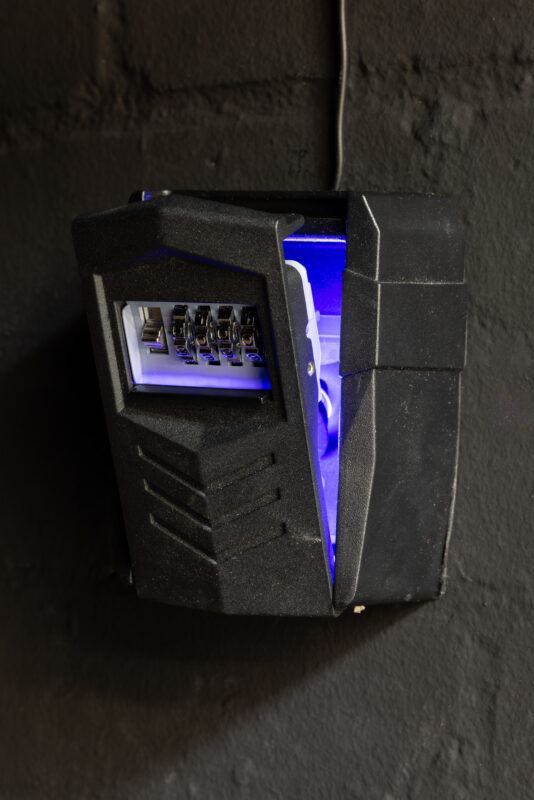 The pillbox embrasure visible from the main room as a sci-fi like architectural flourish, is built into the wall in such a way that it physically imposes and shrinks the already limited space of the dark bunker room. The bunker has a lower ceiling and was dark and quiet, the walls covered with soundproof panels and lockboxes that are ubiquitous on city streets used for subletters or Airbnbers. I kept the lockboxes ajar and wired them with blue LED lights so they functioned as lanterns, the only light source inside the bunker other than the light from the doorway and the small slit of the embrasure that allowed you to look out onto the exhibition (and anyone inside of it in secret). While you do have the “control” or “power” of being able to watch people from this peephole without them knowing, I also wanted to consider at the same time: at what cost? What are the bargains you’re making when your priority is power or control?