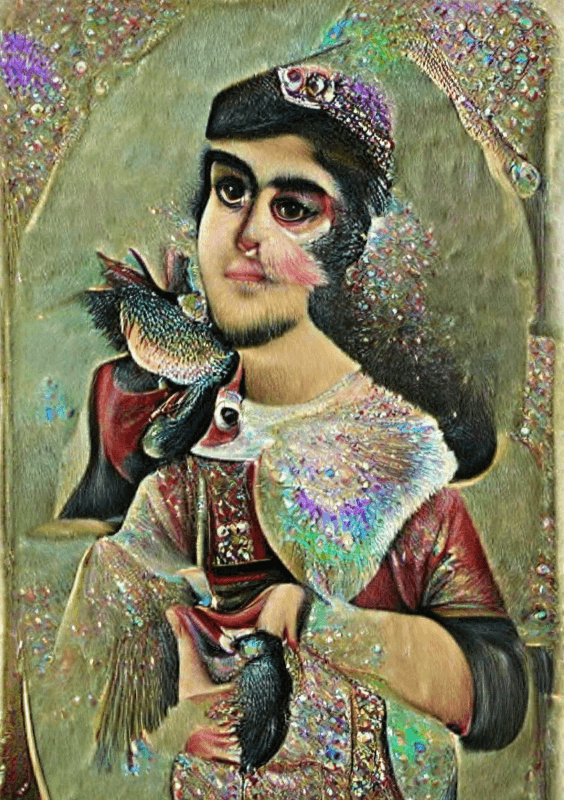 Our world becomes so small when we only understand ourselves through the context of now. History allows you to put things in a context that is much bigger than yourself. But history always comes with the power of those who have had access to telling it. For example, when you think about definitions of queerness from a Western perspective, there is a lot of order and categorizing of identity. But looking at the history of the Qajar Dynasty [1789-1925] in Iran, it’s amazing that what we know as “queerness” today was ordinary. Intimate same-sex relationships were natural. The relationship to beauty and gender was much more fluid. 350 years later, that’s not what we understand about our cultures, due to colonialism and oppression. In my piece Moon-Faced, I work with an AI system, feeding it different visuals and sentences, and asking it to undo the loss of visual representation of this queer culture: to repair this history of colonization.