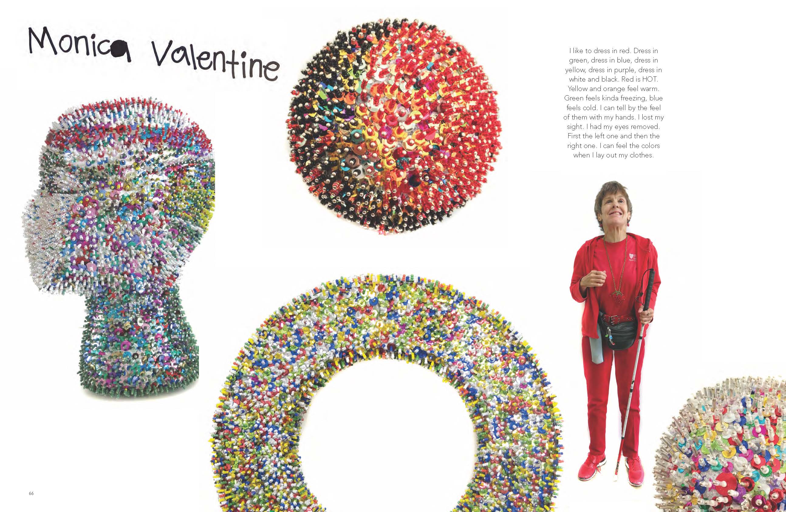 Using pins, colored sequins, beads and shaped foam, Monica Valentine creates sculptures that are both visually rich and tactile. From geometric cubes and spheres to more playful cake shapes, skulls and logs, Valentine’s sculptures draw up the artist’s fascination with color, despite her blindness. Valentine relates to color through her other senses, such as touch, describing her ability to feel the heat of the color red and the cool of the color green. Through this synesthetic relation to color, Valentine speedily pins beads and sequins into the foam body of her sculptures, intuitively grouping similar colors together or positioning contrasting colors in relation to one another. Her work has been described as embodying her cheerfulness and dry sense of humor.