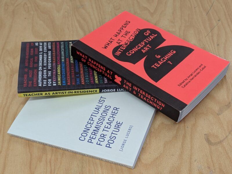 Enter Dr. Jorge Lucero, Full Professor of Art Education in the School of Art + Design and Associate Dean for Research in the College of Fine and Applied Arts at the University of Illinois Urbana-Champaign. I first learned about Lucero’s work from two other Art21 Educators, Sonia D’Agnese and Jess Perry-Martin. Additionally, an Art21 Educators book club explored Lucero’s collaboration Teacher as Artist-in-Residence: The Most Radical Form of Expression to Ever Exist. Lucero is both a teacher and artist who writes and speaks about how he integrates the two practices. He talks about the challenge of doing both simultaneously and how he develops ways to “test the pliability” of his spaces and making within his given time and locations. He asks questions like: How can readily accessible materials become a practice, like folding magazine pages to alter the meaning of both images and the new combined image? How can rearranging bulletin board displays in the halls become art? How can one find “permission” in other artists’ work to do or not to do a given thing?