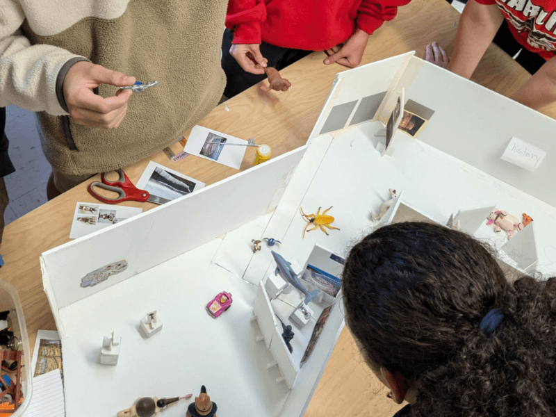 Around the same time, I was finding renewed creative fulfillment in my classroom work through designing student exhibits in our school’s gallery spaces. I had already started thinking about how developing these displays felt like making. Could these acts of curating be an extension of my students’ work? Does this count as my making art? How can students and I collaborate? Lucero’s work, practice, and teaching deeply resonated with me as I pondered these questions. I wondered how I could “test the pliability” of my own constraints, with “permission” from Lucero.
