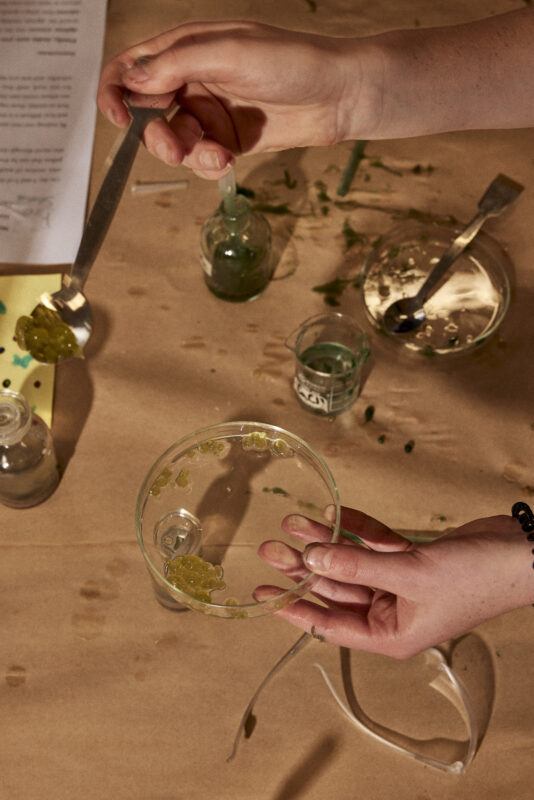 Similarly to Mattingly, Jessie French, a Naarm (Melbourne, Australia) based scientist/artist, explores the possibilities of a “speculative post-petrochemical future” through using algae-based polymers in installations and functional plastics. French suggests there is greater potential in not defining roles and offers provocations for students to consider innovative solutions and to see the interconnectedness of science and art that have a real-world impact.