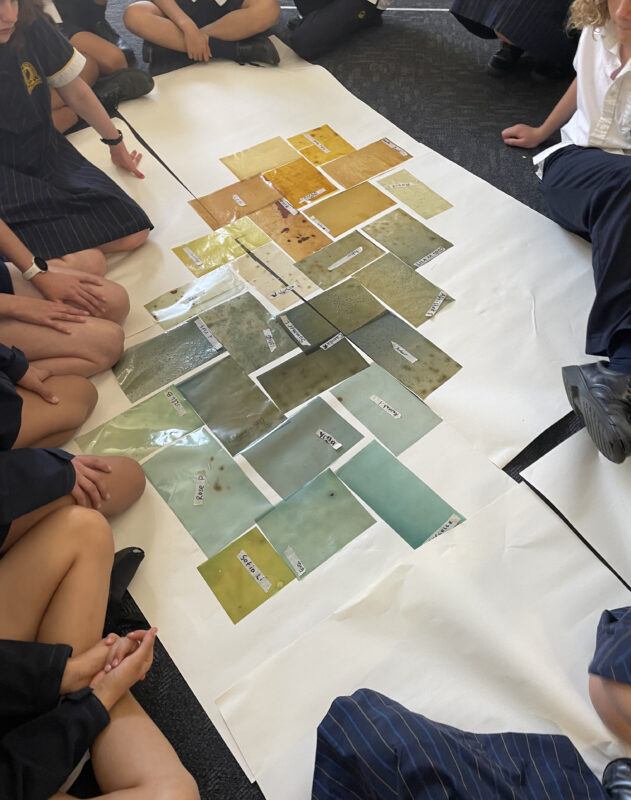 Over the course of Bio-studio, the students took heed of Mattingly’s and French’s practice and made a collaborative artwork using the bioplastics they had produced. The artwork used sustainable and renewable agar, glycerin (a biodegradable substance), and water. The bioplastic was coloured using locally sourced natural materials where possible. Students spoke of the Bio-studio program as an opportunity to learn more about the materials in our class–“I was able to explore the idea of sustainability further, as there is so little that we actually know works, but there’s so much more to experiment with.” Next semester, this artwork and the offcuts will be melted back down and there will be another iteration of learning with another group of students. Nothing will go to the landfill.