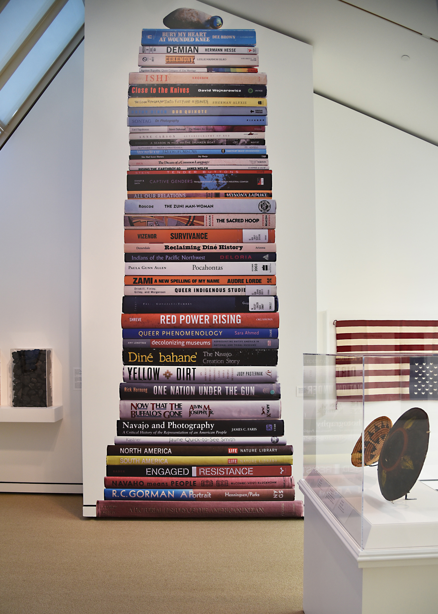 Installation view of Demian DinéYazhi, Untitled (Radical Indigenous Queer Feminist Bibliography), 2016. Mural is a part of Dene bāhī Naabaahii exhibition at the Center for Contemporary Native Art, Portland Art Museum. Photo: Demian DinéYazhi.