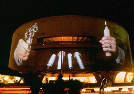 Krzysztof Wodiczko was born in 1943 in Warsaw, Poland, and lives and works in New York and Cambridge, Massachusetts. Since 1980, he has created more than seventy large-scale slide and video projections of politically charged images on architectural façades and monuments worldwide. By appropriating public buildings and monuments as backdrops for projections, Wodiczko focuses attention on ways in which architecture and monuments reflect collective memory and history. In 1996, he added sound and motion to the projections, and began to collaborate with communities around chosen projection sites—giving voice to the concerns of heretofore marginalized and silent citizens who live in the monuments’ shadows.
