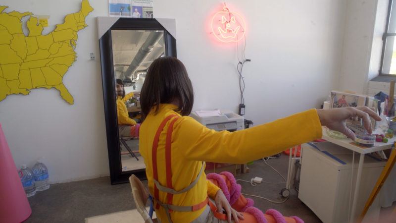 Da Corte was raised between Camden, New Jersey; Pittsburgh, Pennsylvania; and Caracas, Venezuela. As a child, he aspired to be a Walt Disney animator. References to Disney cartoons and familiar characters from children’s stories, like Frankenstein’s monster and the Wicked Witch of the West, reoccur in his videos alongside anthropomorphized everyday objects such as a bottle of ketchup and pop-culture figures like the rapper Eminem. Da Corte portrays many of the characters in his videos himself. The videos are installed in dreamlike, immersive environments, replete with colorful carpets, brightly painted walls, and neon lights. Underscoring the handmade nature of his work is its sleek and highly stylized appearance; Da Corte works with a team of artists to create every aspect of the videos and installations, from make-up to costumes to set pieces. Da Corte’s contrasting, remixing and flattening of disparate images and icons detaches them from their original meanings, allowing him to concoct new stories about familiar characters with a mixture of empathy, criticism, comedy, and the macabre.