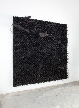 Leonardo Drew was born in Tallahassee, Florida in 1961, and grew up in Bridgeport, Connecticut. Although often mistaken for accumulations of found objects, his sculptures are instead made of “brand new stuff”—materials such as wood, rusted iron, cotton, paper, and mud—that he intentionally subjects to processes of weathering, burning, oxidation, and decay. Whether jutting out from a wall or traversing rooms as freestanding installations, his pieces challenge the architecture of the space in which they’re shown.