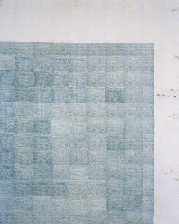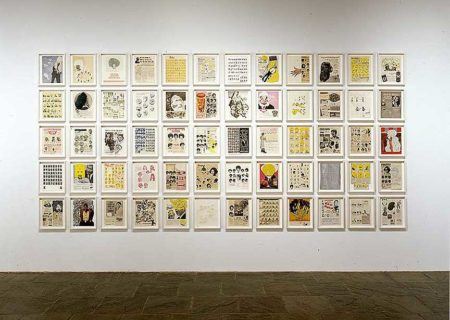 Although the work has often been interpreted strictly as an examination of race, Gallagher also suggests a more formal reading with respect to materials, processes, and insistences. From afar, the work appears abstract and minimal; upon closer inspection, googly eyes, reconfigured wigs, tongues, and lips of minstrel caricatures multiply in detail. Gallagher has been influenced by the sublime aesthetics of Agnes Martin’s paintings, as well the subtle shifts and repetitions of Gertrude Stein’s writing. In her earlier works, Gallagher glued pages of penmanship paper onto stretched canvas and then drew and painted on it. In Watery Ecstatic (2002–04), she literally carved images into thick watercolor paper, in her own version of scrimshaw, from which emerge images of the sea creatures from Drexciya, a mythical underwater Black Atlantis.