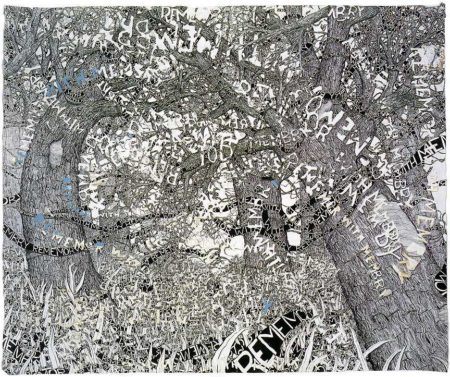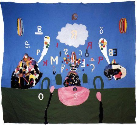 Trenton Doyle Hancock was born in 1974 in Oklahoma City, Oklahoma. Raised in Paris, Texas, Hancock earned his BFA from Texas A&M University, Commerce, and his MFA from the Tyler School of Art at Temple University, Philadelphia. Hancock’s prints, drawings, and collaged-felt paintings work together to tell the story of the Mounds—a group of mythical creatures that are the tragic protagonists of the artist’s unfolding narrative. Each new work by Hancock is a contribution to the saga of the Mounds, portraying the birth, life, death, afterlife, and even dream states of these half-animal, half-plant creatures.