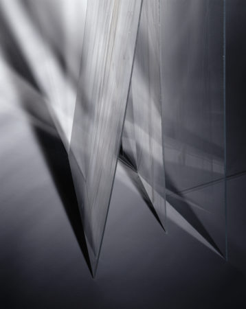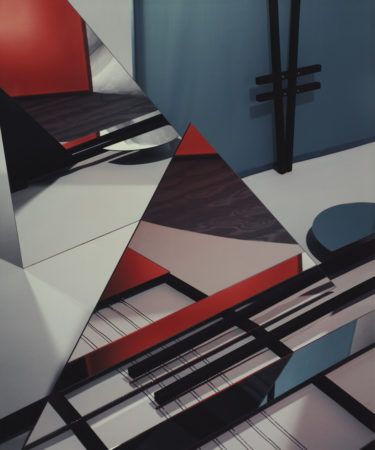 This led her to photograph elaborate compositions of objects in the studio—such as Platonic shapes, paper, plexiglass, and wire—often illuminated by theatrical lighting and colored gels. When recorded by her large-format camera—and without digital manipulation—Kasten’s arrangements become ambiguous in scale, confusing in spatial dimensions, and uncertain in differentiation between surface, shape, and shadow.
