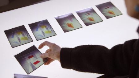 On a grander scale, Kasten also pictures architectural spaces and landscapes, manipulating the environment through carefully placed mirrors and dramatic gemlike tones. Kasten’s video projections of rotating objects and planes of drifting color, cast onto building exteriors and interiors, destabilize the architecture through the optical fragmentation of forms.