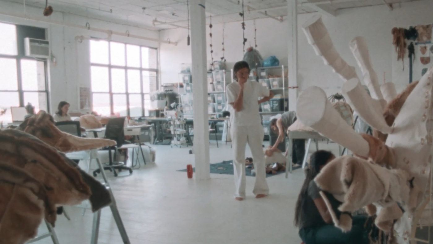 In her two-dimensional work, Lewis continues to reference and expand on the human body, creating new symbologies that seem to possess a kind of mythological wisdom. Three large tapestries made of layered leather, suede, and other found fabrics, Knot of Pacification (2021), Tree of God (2021), and God is King (2021), are populated by infants whose stomachs are conjoined, often carrying more infants in their brains. Large eyes preside over them, and animals such as moths and snakes surround them. Leather, a material she is frequently drawn to, speaks of the bodily – made from skin, it collects scents and impressions from both its past life and from the process of being refashioned. Through her attentive and often intimate working process, she strives to give the work what it asks for, trusting that it, in turn, will speak for itself.