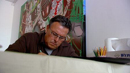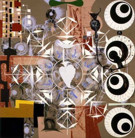 Lari Pittman was born in Los Angeles, California, in 1952. Pittman received both a BFA (1974) and an MFA (1976) from California Institute of the Arts, Valencia. Inspired by commercial advertising, folk art, and decorative traditions, his meticulously layered paintings transform pattern and signage into luxurious scenes fraught with complexity, difference, and desire. In a manner both visually gripping and psychologically strange, Pittman’s hallucinatory works reference myriad aesthetic styles, from Victorian silhouettes to social realist murals to Mexican “retablos.”