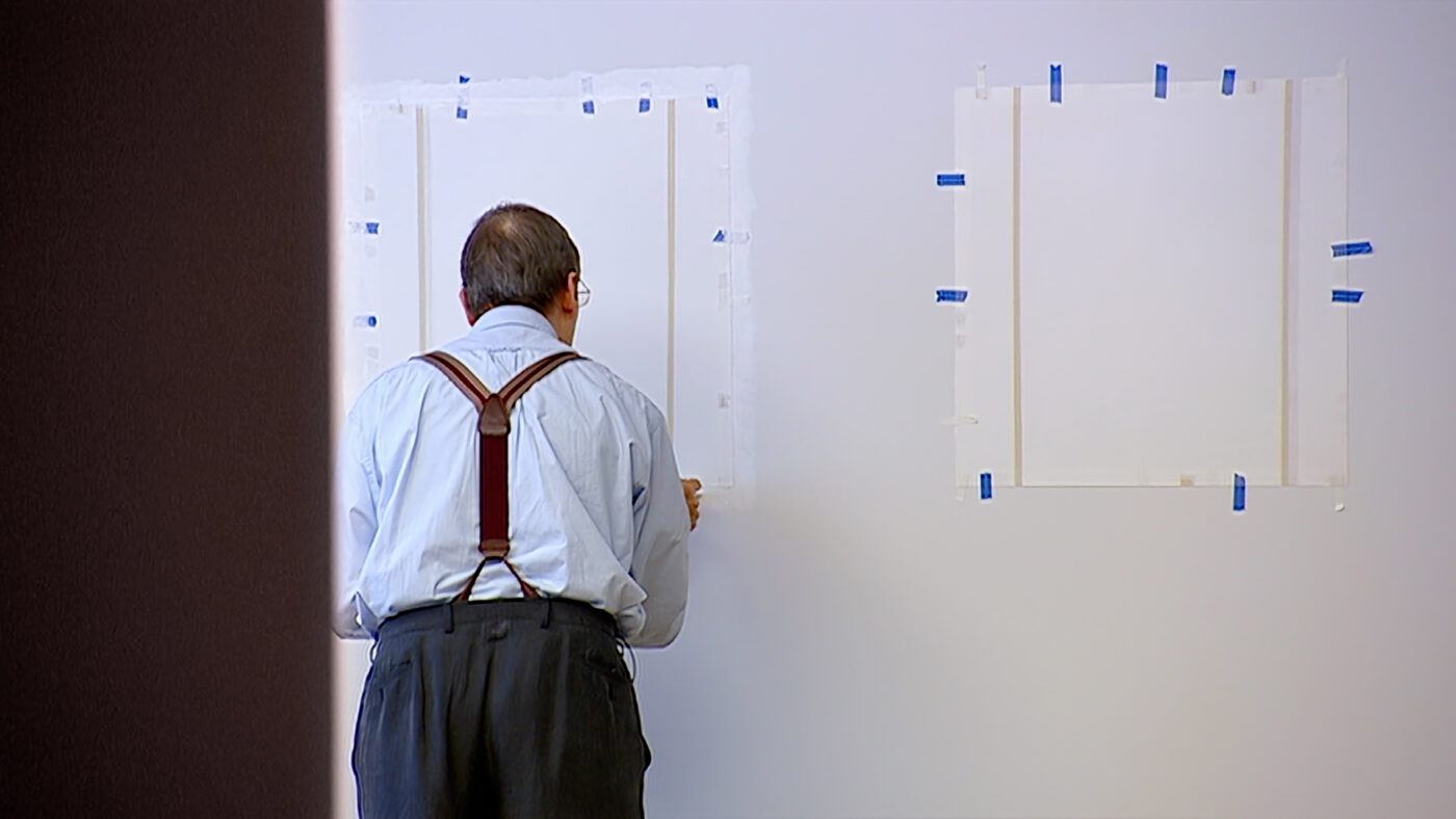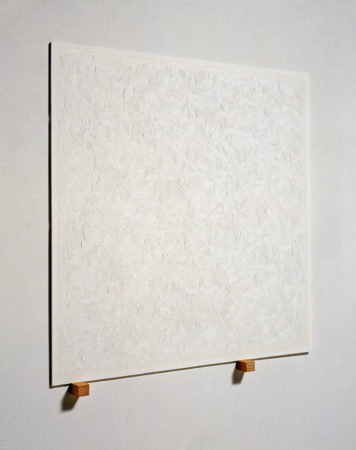 Ryman isolates the most basic of components (material, scale, and support), enforcing limitations that allow the viewer to focus on the physical presence of the work in space. Since the 1950s, Ryman has used primarily white paint on a square surface—whether canvas, paper, metal, plastic, or wood—while harnessing the nuanced effects of light and shadow to animate his work. In Ryman’s oeuvre, wall fasteners and tape serve both practical and aesthetic purposes. Neither abstract nor entirely monochromatic, Ryman’s paintings are paradoxically “realist” according to the artist’s own lexicon.