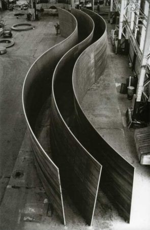 Inspired by his early experiences working in steel mills and shipyards, Serra warped materials such as steel and lead into abstract, geometric, and flowing shapes. In his Splash PIeces series (1968-1970), the artist threw molten lead from a ladle, splattering it on the corner where the floor meets the wall. After hardening, the works became individual casts and sculptures in themselves. The resulting sculptures, such as Gutter Corner Splash: Night Shift, (1969/1995), foregrounded the role of process as well as the specificity of the materials and spaces with which the work was made.“ If I think I can invent a new way of looking at those elements, or make the possibility of walking in and through and around a piece something that startles me, then I think that there’s a possibility to proceed.” Working within site-specific locations, Serra constructed a new way of looking at the material, emphasizing its materiality and positionality within a specific space.