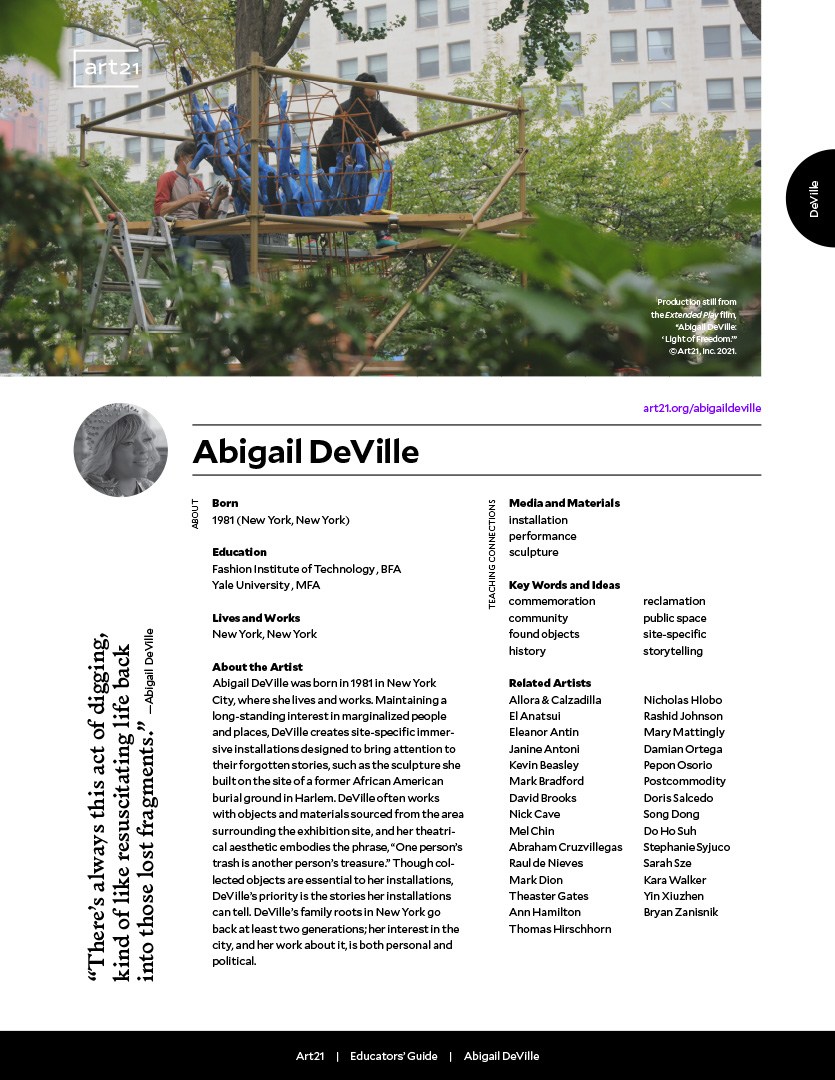 The questions and activities included in this guide are recommendations for incorporating Art21 films featuring Abigail DeVille into your classroom.