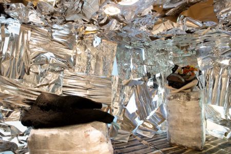 How do you get your audience to touch the art? Artist Abigail DeVille constructs the set for a premiere performance of Adrienne Kennedy’s play She Talks to Beethoven (1989) at the JACK arts center in Clinton Hill, Brooklyn. Theater director Charlotte Brathwaite describes the play’s dreamlike style and time-bending narrative: an American expatriate in 1960’s Ghana “converses” with Beethoven in early 1800s Vienna. DeVille draws parallels between the play’s temporal cross-cutting and theoretical physics—specifically the concept of wormholes, or passageways in the space-time continuum—as well as the hidden histories and absences that mark the African American experience.