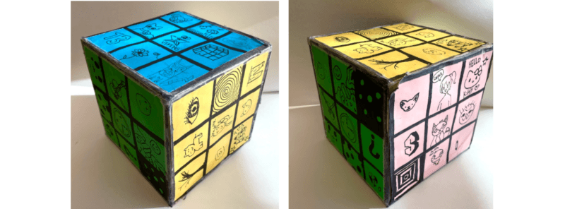 One student’s reflection states, “Our project is called 54 Friends. It is a Rubik’s Cube with 54 squares. By the end of the activity we hoped to meet 54 new people. We asked different people to draw whatever they wanted (as long as it is school appropriate). When we asked people to draw on the box they often asked “what should I draw?” So we asked them questions like what’s your favorite animal, what’s your favorite object, subject, colour. And because of this we got to know them better and talked to people we never talked to before. It is aesthetic because everything each person draws tells me something about them.”