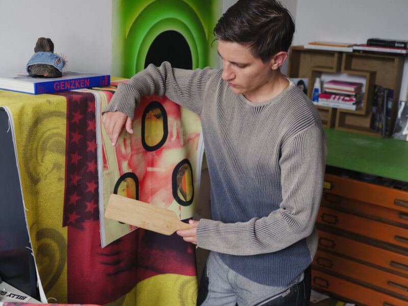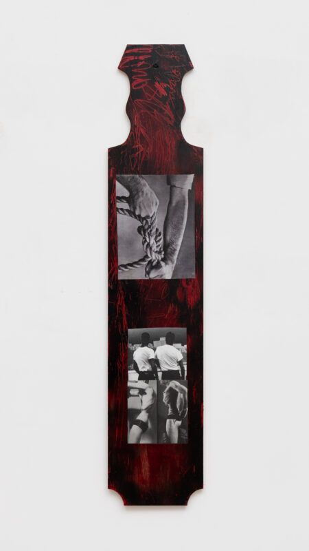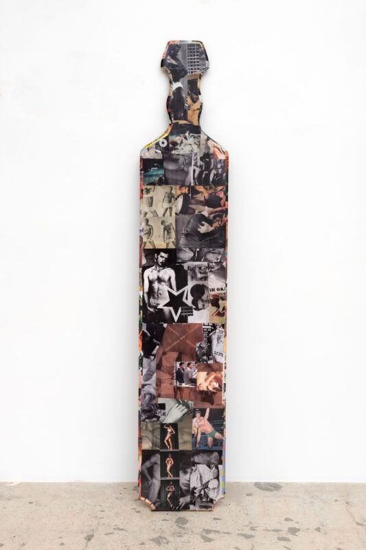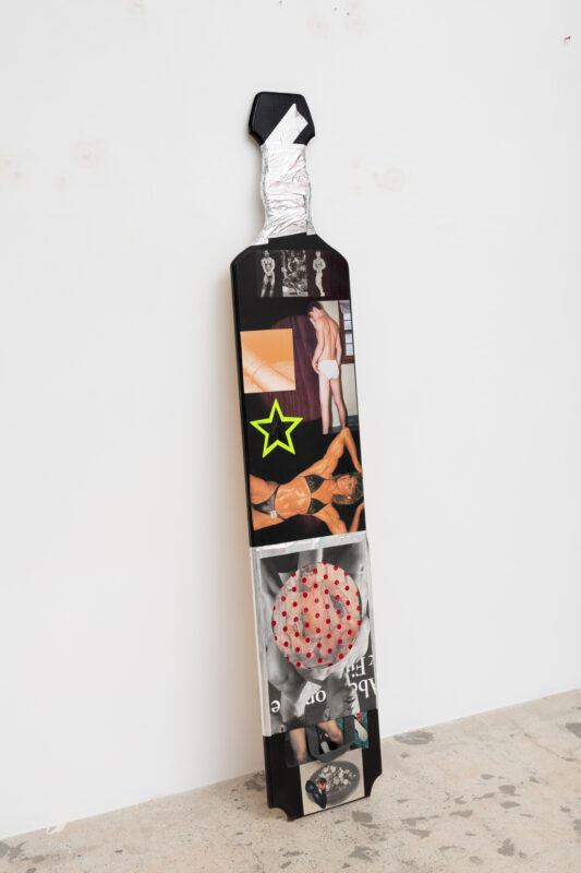The paddles are made of wood and all have the same silhouette. The imagery on them is taken from a variety of sources, some of which are pornographic. A lot of motifs that are important within my practice recur: rope, bullets, targets, dicks, muscles, appendages, restraints, siblings, and twins. By cutting these images up and taking them out of their original context, even and especially, the nonpornographic images start to seem sexual. A classic anti-porn argument is that porn is wrong because it cuts up people’s bodies and objectifies parts at the expense of the whole. It’s an anti-collage argument!