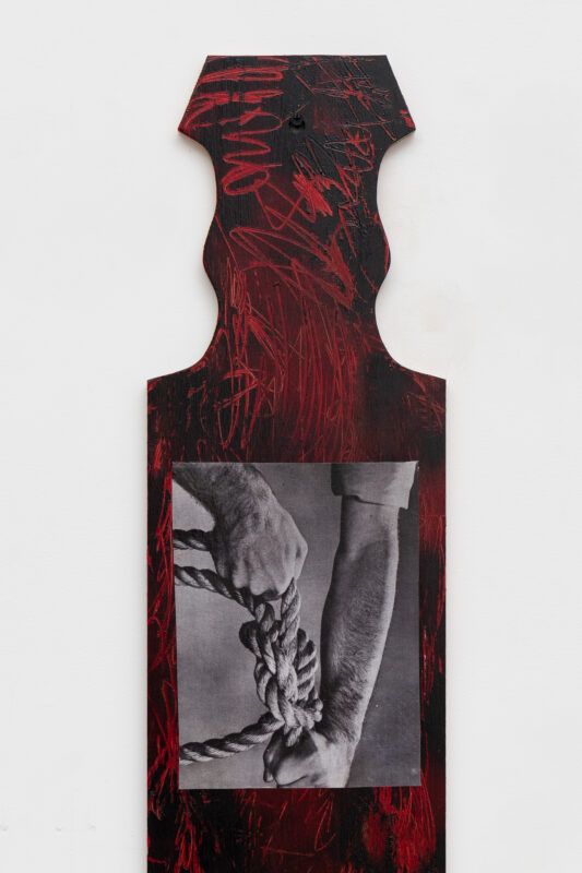 Some of the images I find to be most bizarre and beautiful, and can feel particularly erotic in the environment of the paddles, are from old fraternity yearbook magazines taken in very mundane contexts. Objects like chairs, close-ups of rope, and hands that look like they are in latex gloves reaching out to touch one another become more strange and complicated in the context of my work. I’m aware of and interested in the one-noted or “obviousness” of the pornographic images mixed into my work, but they are also being taken out of their immediate context of titillation. There’s something about them that’s strange, that you come back to and think about. I try not to overly complicate the connections, but to allow for room and to let that which is already quite complicated be complex rather than just a one-to-one juxtaposition.