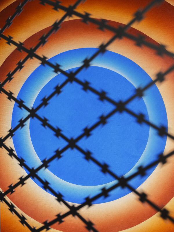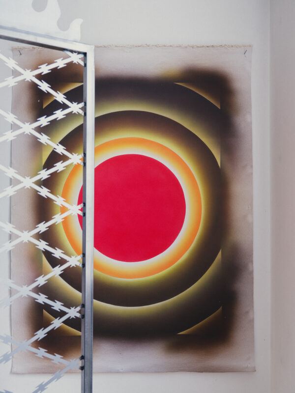 Within the exhibition, there is a peephole referencing a pillbox embrasure. In making this I was inspired by the ICA’s proximity to The Citadel, a war bunker camouflaged by ivy. I’m interested in how these violent mechanisms of control, whether it’s literal weaponry or architecture that’s created for violence, produce an intentional design sense that underlies the human within the inhumane. If you’re a soldier, the pillbox embrasure is designed to have your gun be outside and if someone’s shooting at you, you’re a lot harder to hit because there’s just a little slit and the bullet will ricochet off of the pillbox. However, it also has the motif of mise en abyme, of concentric rectangles: it becomes a frame within a frame, a world within a world. It’s interesting to consider this tension and what happens when we recognize how designed the world around us is, particularly things designed to appear “natural” or inevitable and to consider what happens when violence is abstracted in plain sight.