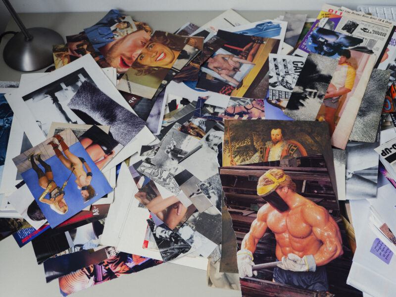 The idea of restraint is important and comes up in my practice in literal ways (images of men tied up taken from BDSM magazines) and in more figurative ways (cutouts from mainstream fashion and advertising, like 2000s Abercrombie & Fitch materials). In the latter, there is another kind of restraint or restriction of the body at play: these bodies represent a lack or exclusion, you realize what is missing in this narrow idea of “All-American” imagery (i.e, white, toned, young, seemingly affluent, and “collegiate”). There’s a darkness, a fraught heaviness in revisiting these nostalgic images, we like to believe we “know better” but they can still have the power to seduce us all over again, especially when looking through a homoerotic lens. There’s both pleasure and violence in these restrictive constructions of masculinity that I’m interested in, there’s a constant interplay going on—a dance or a wrestling match between signs, identities, domination and surrender, reality and fantasy. Collage can allow us to look at images differently, especially the ones we feel we may already know so well. Hopefully, there’s a bit of catharsis in those juxtapositions.