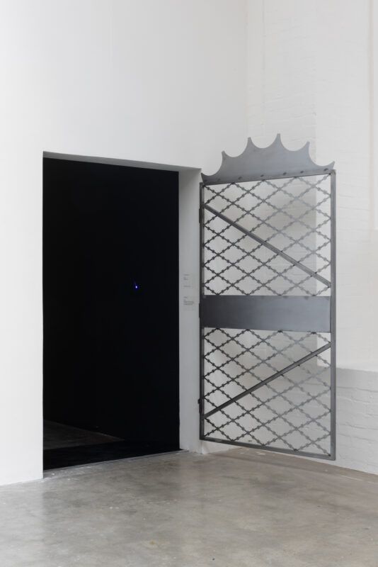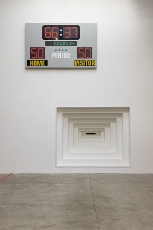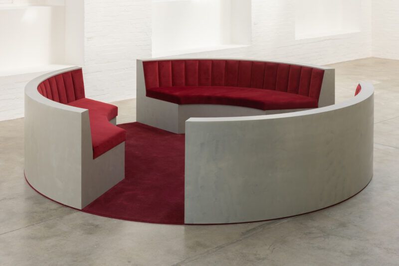 In the exhibition, the main gallery was brightly lit and included various works and architectural interventions: from a large basketball scoreboard mysteriously counting down and keeping score to a frieze of sunsets taken from Rainer Werner Fassbinder’s “Querelle,” to a red velvet and concrete circular conversation pit and whitewashed windows. In contrast, I turned what is normally the “Reading Room” annex space into a sort of bunker, separated from the main room by a perpetually-open steel razor wire ornate door.