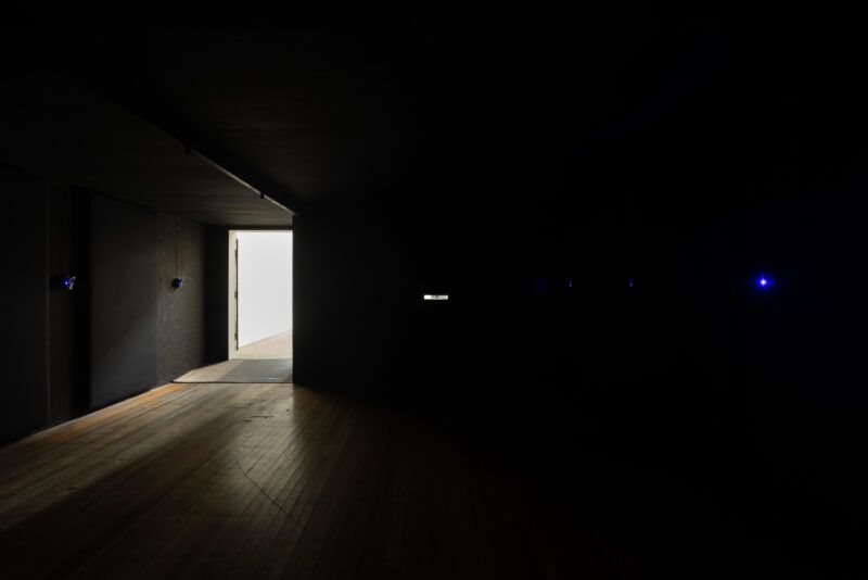 The pillbox embrasure visible from the main room as a sci-fi like architectural flourish, is built into the wall in such a way that it physically imposes and shrinks the already limited space of the dark bunker room. The bunker has a lower ceiling and was dark and quiet, the walls covered with soundproof panels and lockboxes that are ubiquitous on city streets used for subletters or Airbnbers. I kept the lockboxes ajar and wired them with blue LED lights so they functioned as lanterns, the only light source inside the bunker other than the light from the doorway and the small slit of the embrasure that allowed you to look out onto the exhibition (and anyone inside of it in secret). While you do have the “control” or “power” of being able to watch people from this peephole without them knowing, I also wanted to consider at the same time: at what cost? What are the bargains you’re making when your priority is power or control?
